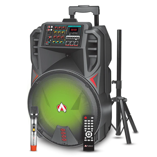 The Audionic Mehfil MH-815 is a powerful 15-inch portable trolley speaker built for large gatherings, outdoor events, karaoke nights, and professional use. With its high-output sound, vibrant lighting effects, and easy portability, the MH-815 delivers an immersive entertainment experience wherever you go.