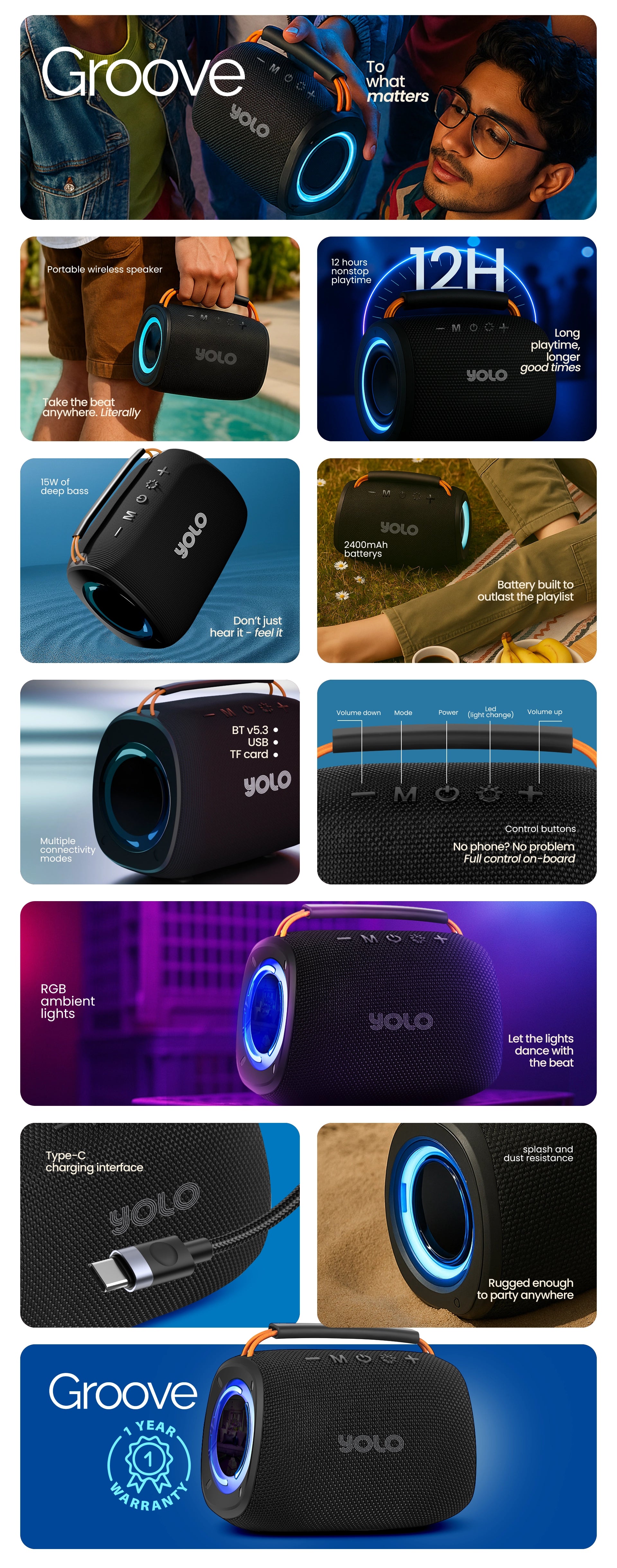 YOLO Groove Wireless Speaker | 15W Deep Bass | 12H Playtime | Bluetooth 5.3 | LED Light
